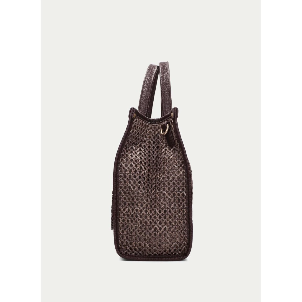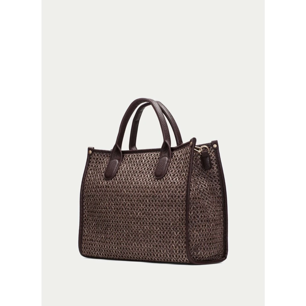 Dominantou je rafie Marrakech v tmavě hnědém tónu, která působí přirozeně, strukturovaně a zároveň velmi luxusně. Kombinace přírodního vzhledu a hlubší barvy dodává kabelce nadčasovost a snadnou kombinovatelnost napříč sezónami.