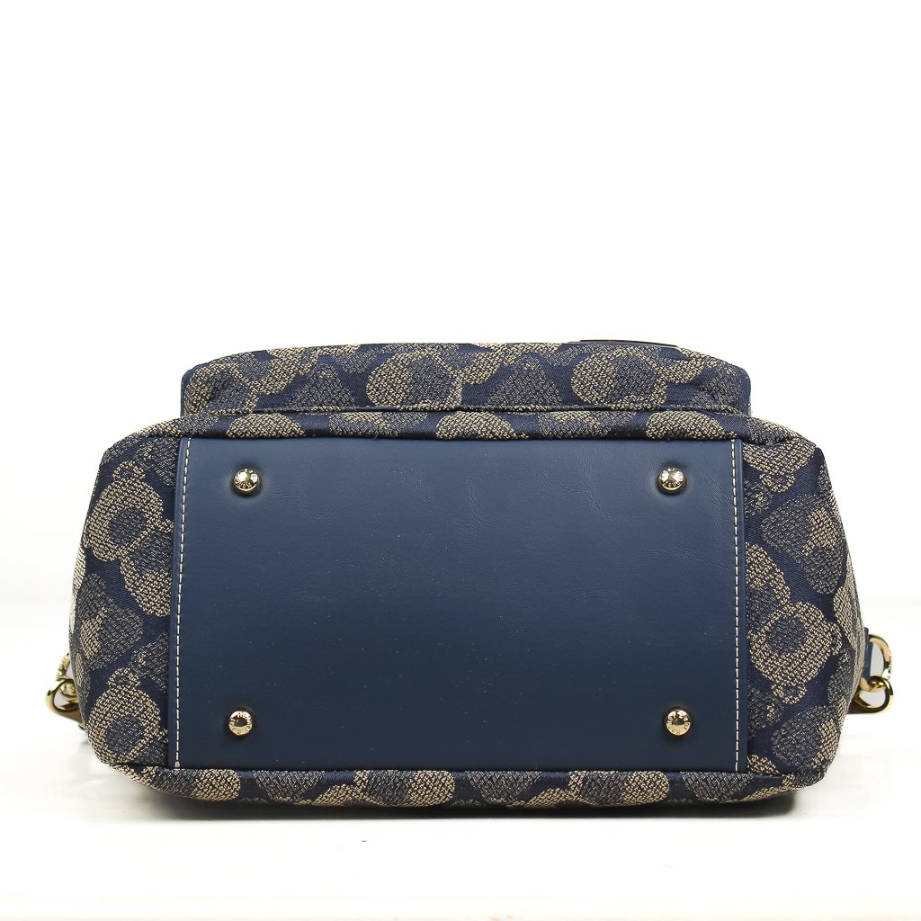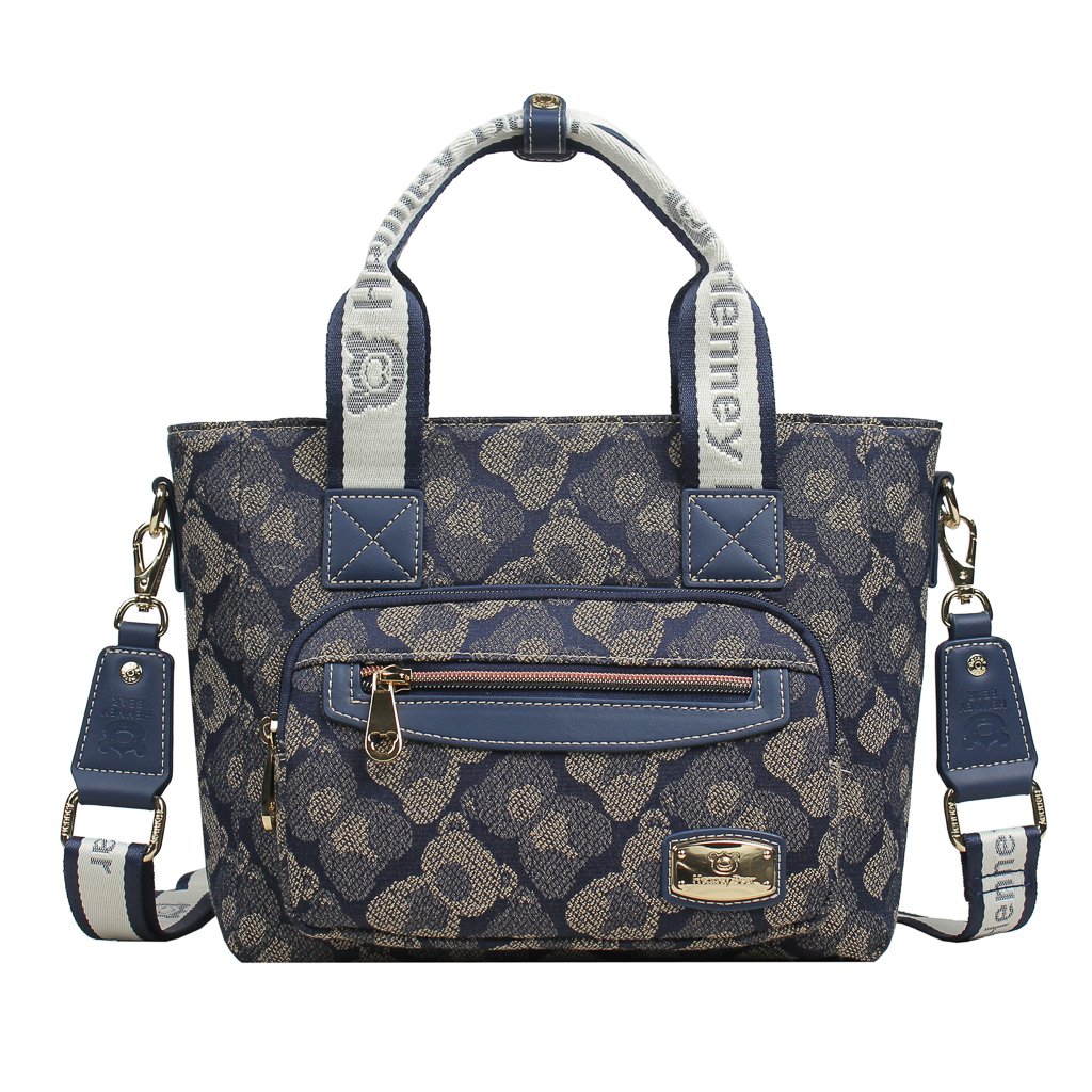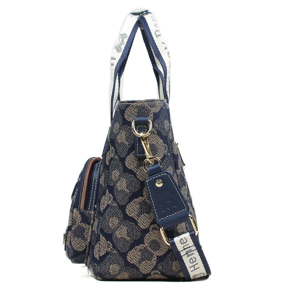 Tato kompaktní kabelka (šířka 32 cm, hloubka 15 cm, výška 22 cm) vyniká svým jemným gobelínovým vzorem medvídků v decentních modrých tónech. Kombinuje ikonický design a praktické využití – má pevná ucha, odnímatelný popruh a kapsy na zip pro tvůj komfort a bezpečí.