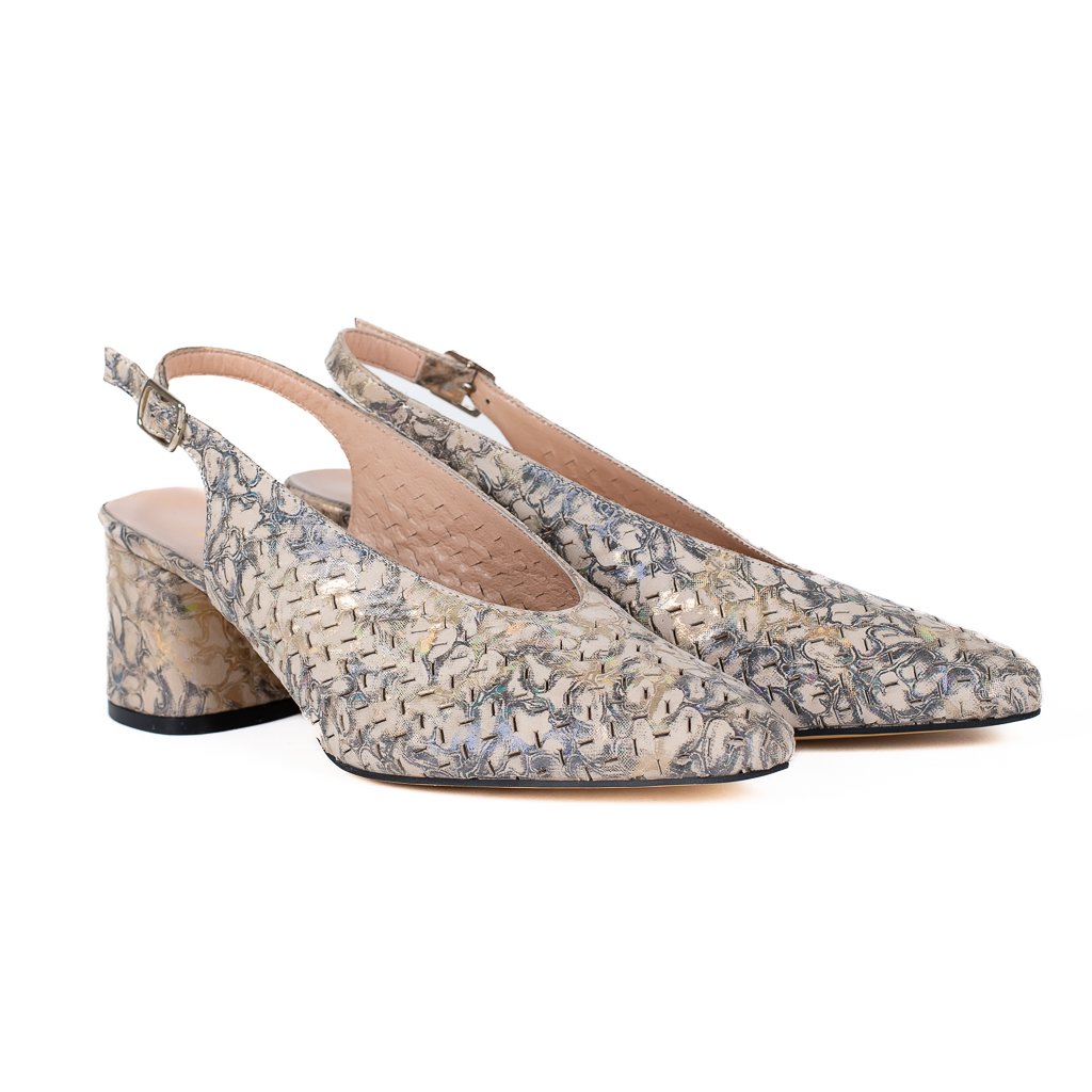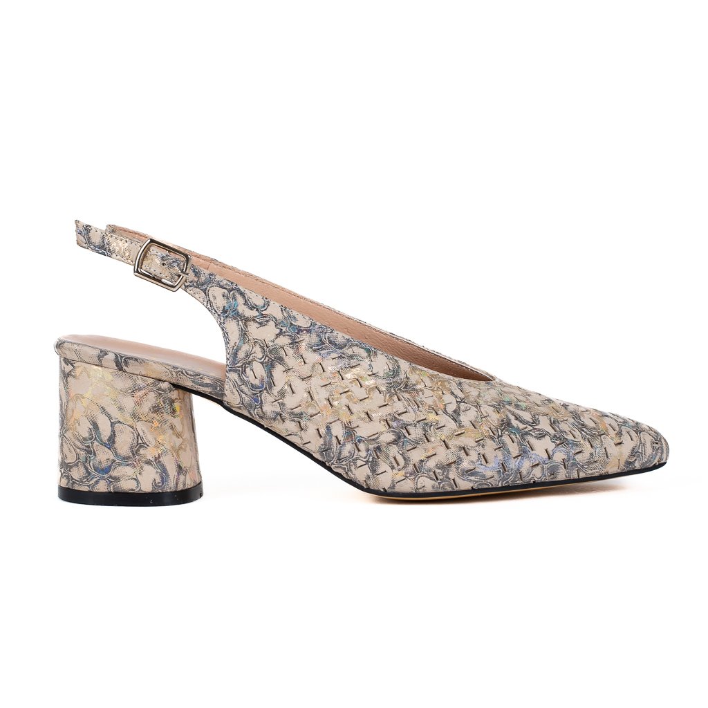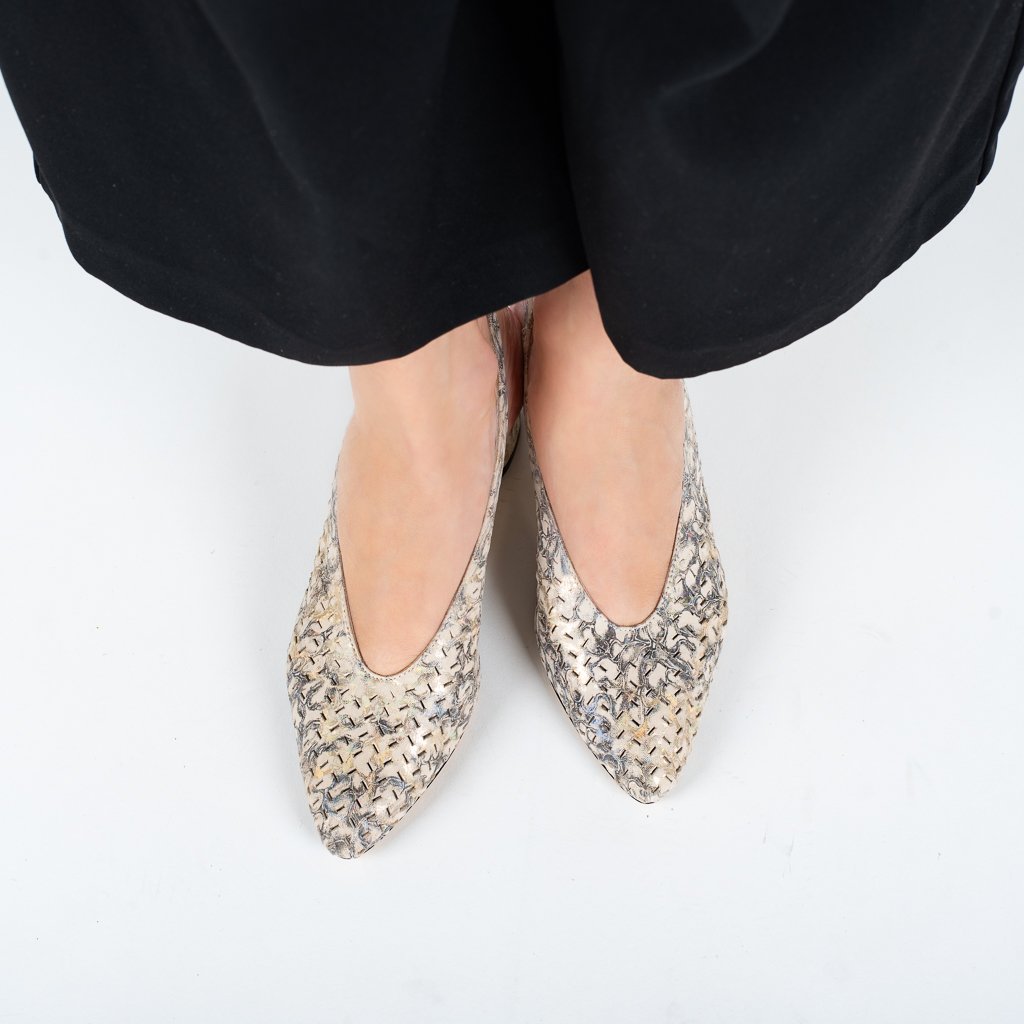 Béžové perforované kožené lodičky Letizia s jemným metalickým efektem působí klidně, elegantně a zároveň velmi zajímavě. 👠✨ Béžový podklad doplněný o jemné metalické odlesky vytváří živý, ale stále decentní vzhled, který se krásně mění podle světla a dodává botám hloubku i originalitu. Celek působí sofistikovaně a snadno se kombinuje s neutrálními i slavnostnějšími outfity.