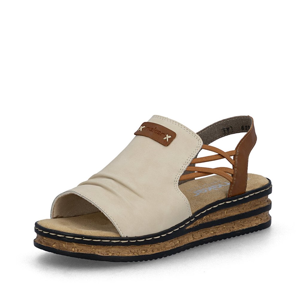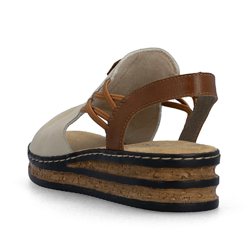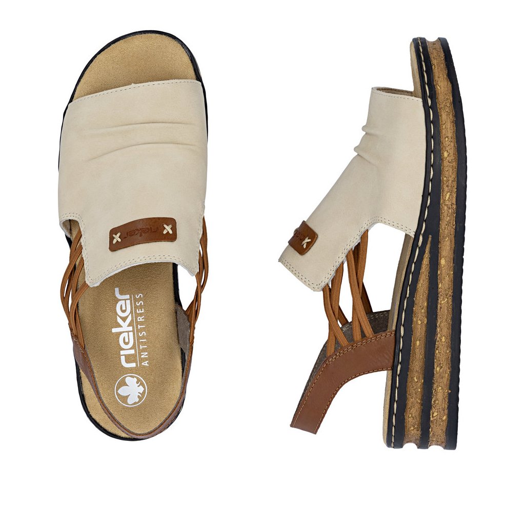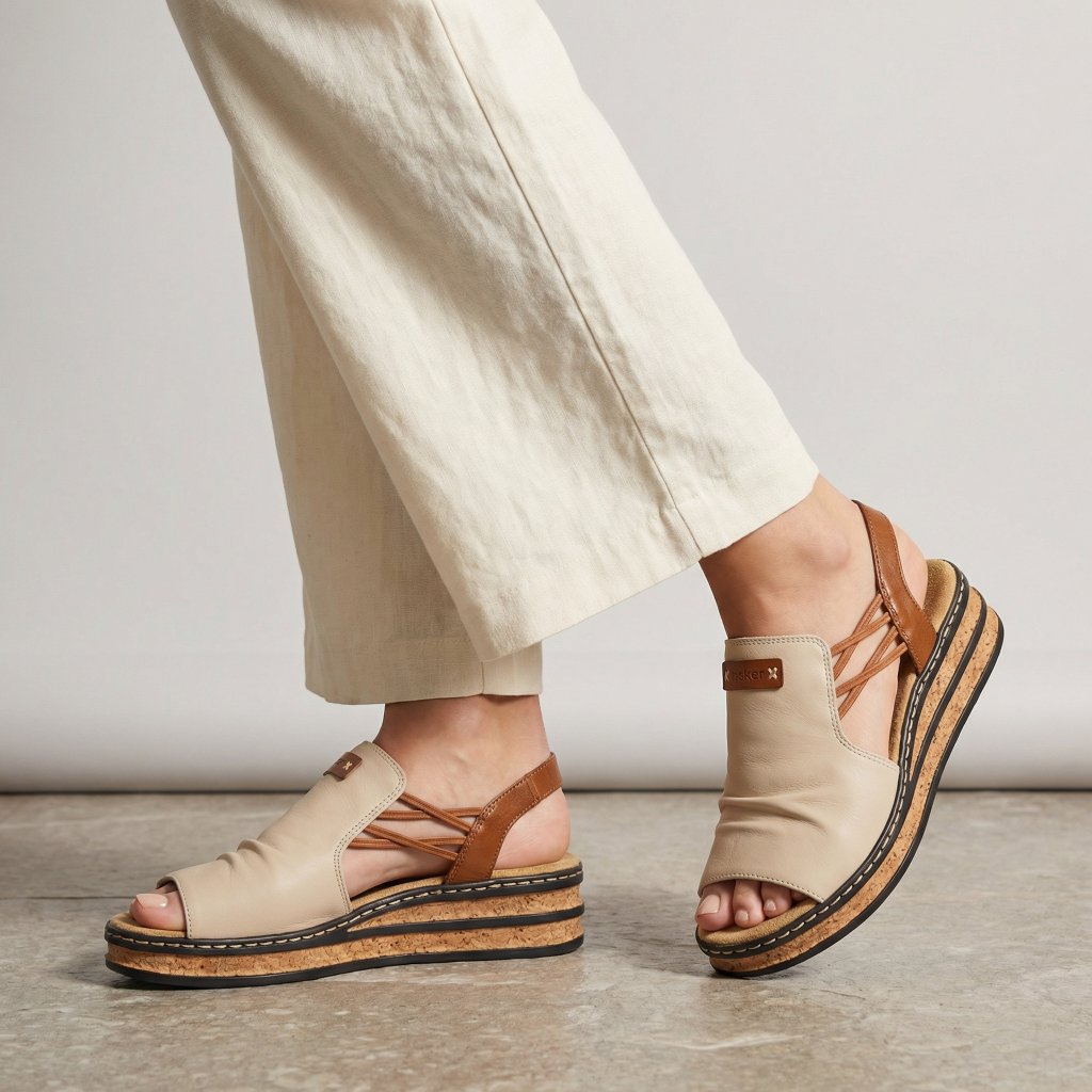 Dámské béžové sandály Rieker na klínku spojují pohodlí, lehkost a přirozený styl. Kombinace jemných přírodních tónů krásně ladí s letním šatníkem – zejména se lnem, béžovou, krémovou nebo hnědou.