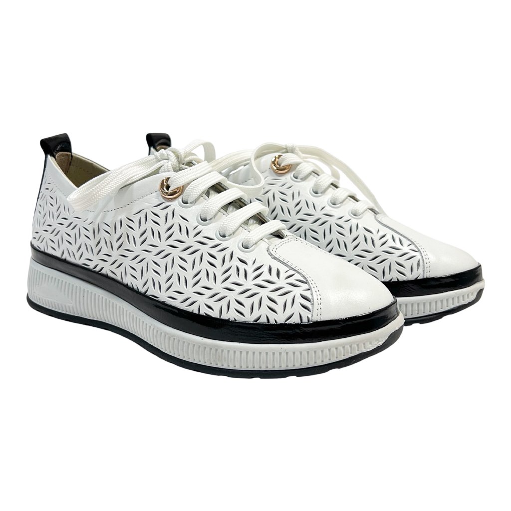 Dámské bílé perforované polobotky Letizia jsou důkazem, že pohodlí a elegance se nevylučují. Čistá bílá kůže v kombinaci s kontrastní černou podrážkou a jemnými zlatými detaily působí moderně, svěže a velmi žensky. 🤍