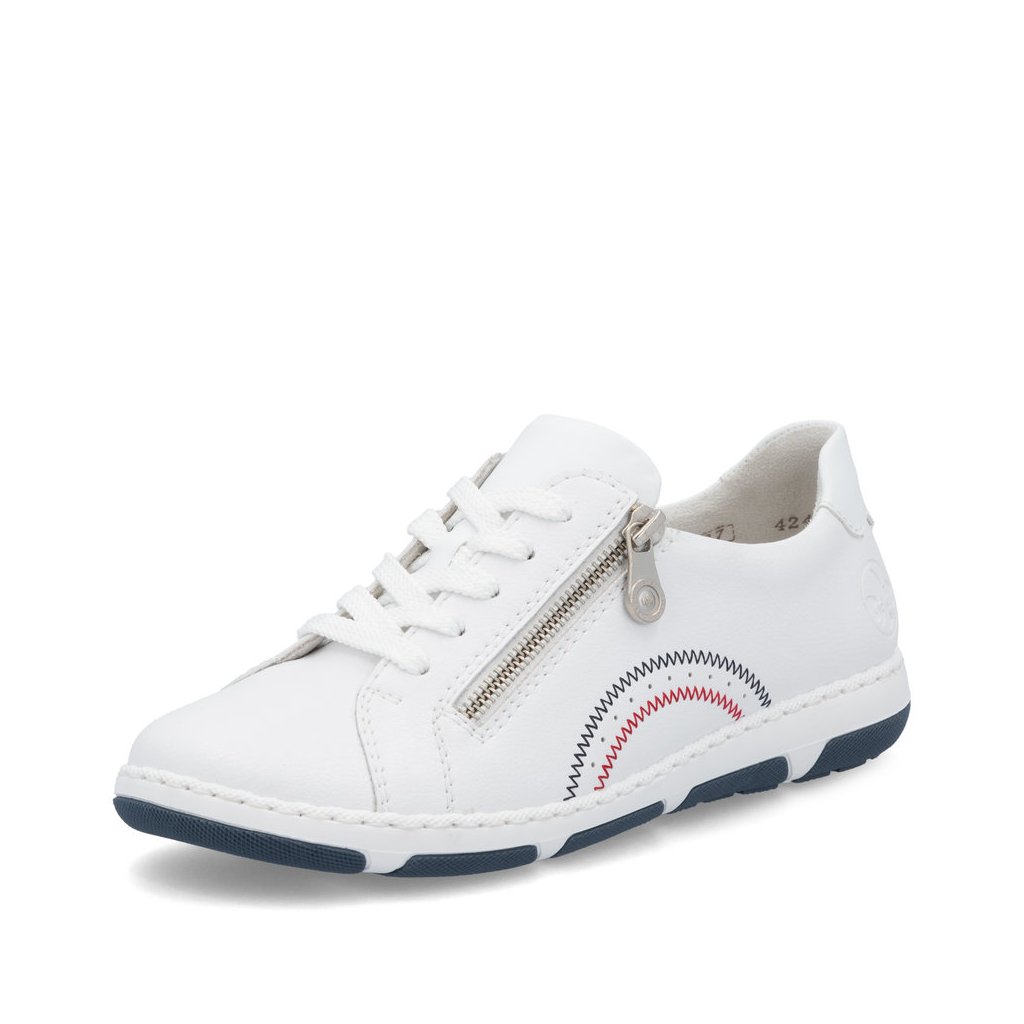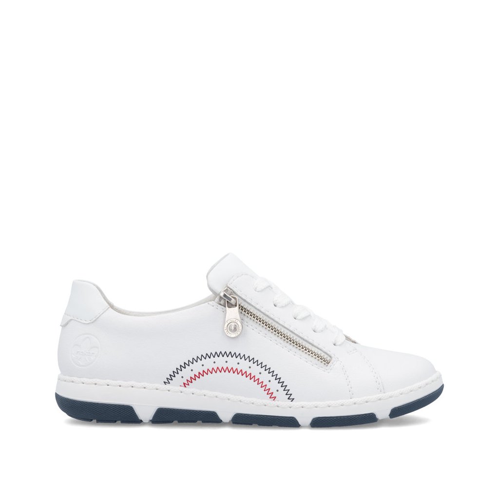 Dámské bílé kožené polobotky Rieker si oblíbíte pro jejich jednoduchost, pohodlí a praktičnost. Čistý bílý design s kontrastním modročerveným prošíváním působí svěže a nadčasově, takže se snadno kombinuje s džínami, šaty i ležérními kalhotami.