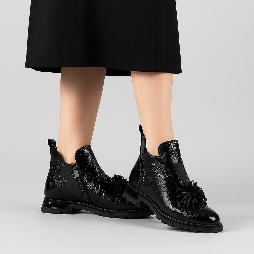Když říkáme „květinový detail“, nemyslíme žádný roztomilý motiv. Tohle je sebevědomý kousek, co vás nenechá zapadnout v davu. Tyto černé kotníkové polobotky Letizia z lakované kůže kombinují lesk, strukturu a 3D květinovou aplikaci, která přitáhne pozornost.