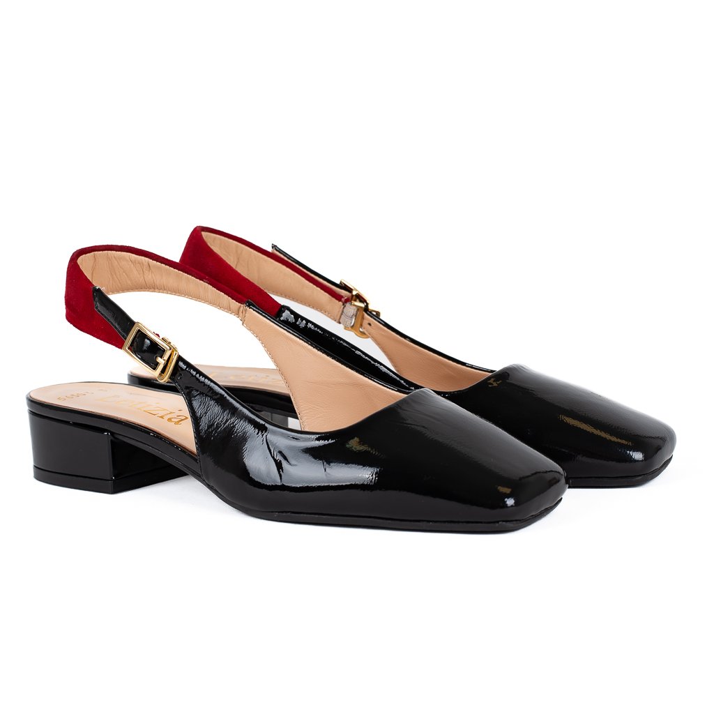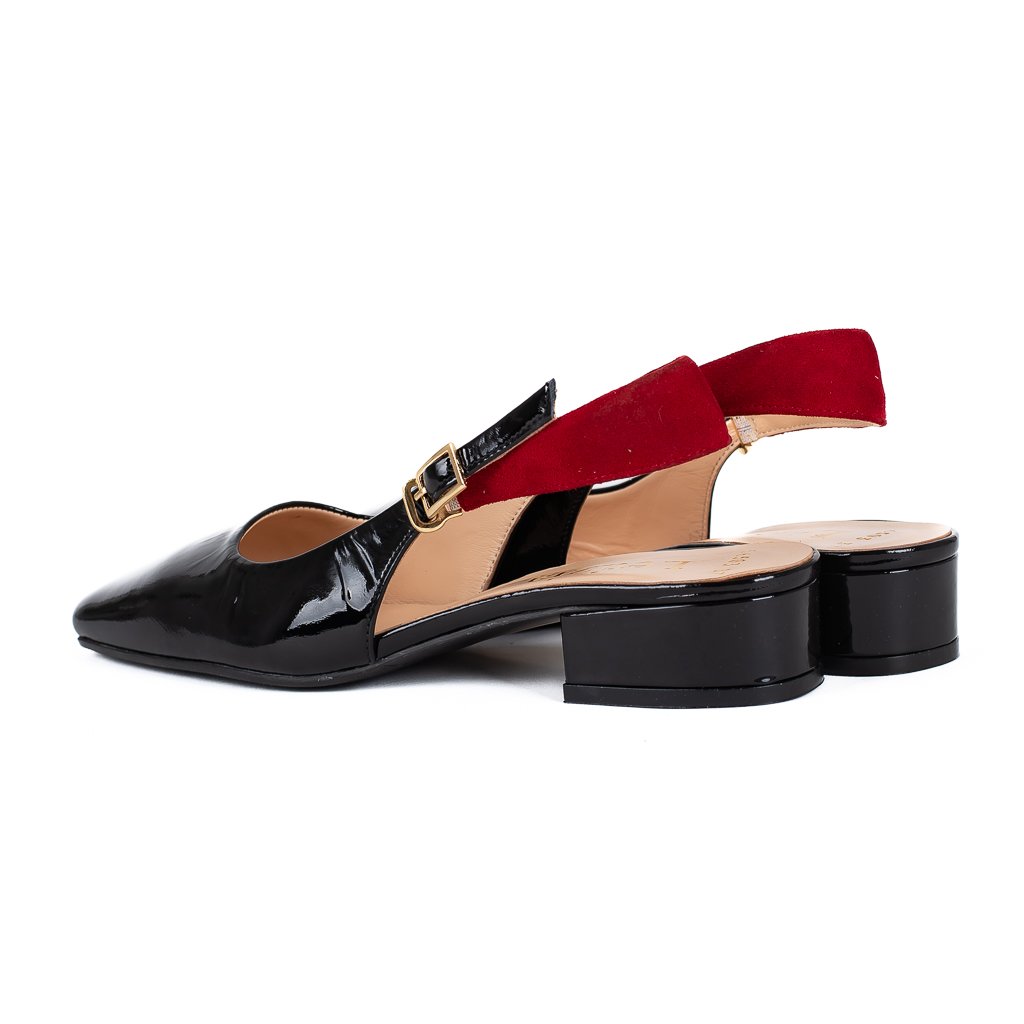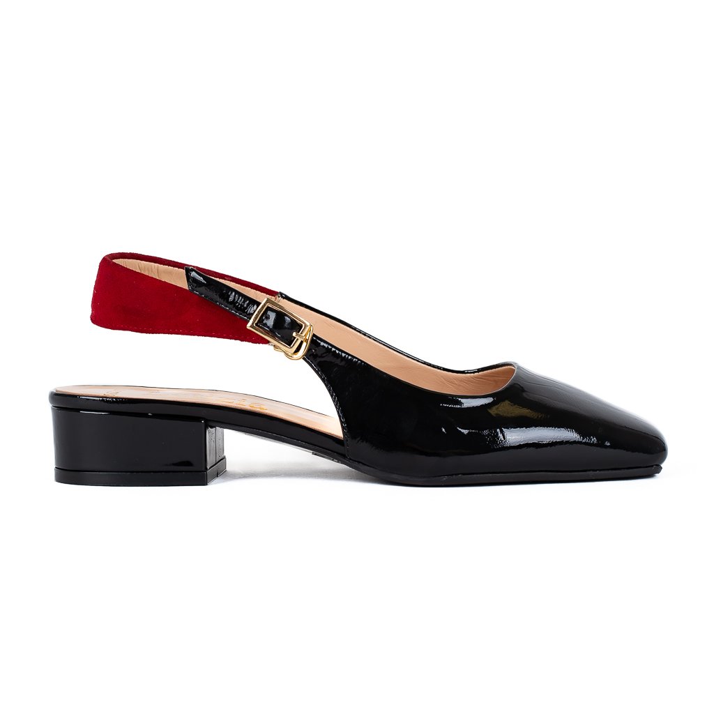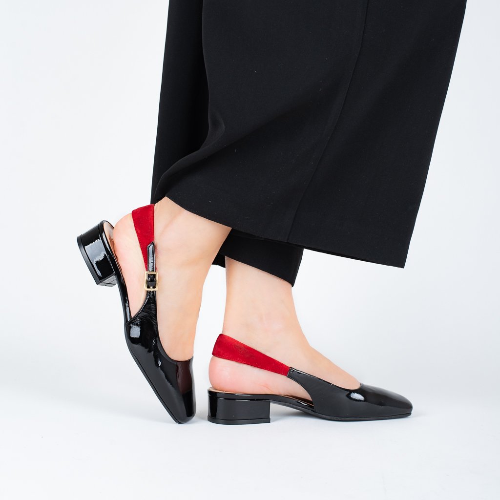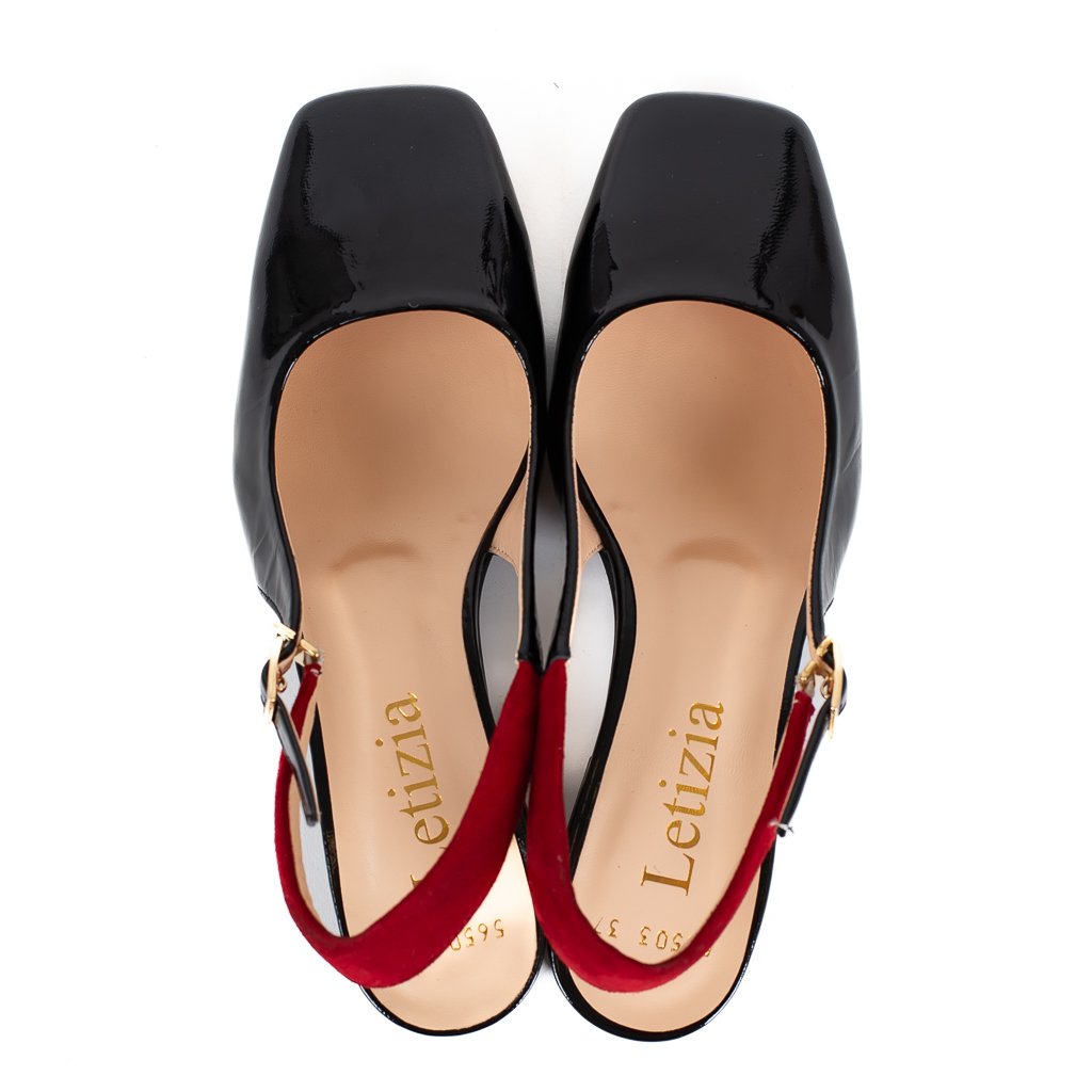 Černo-červené lodičky Letizia s otevřenou patou staví na osvědčené kombinaci barev, která nikdy neztrácí sílu ani eleganci. Lesklý černý svršek působí čistě a sebevědomě, zatímco červený pásek z broušené kůže kolem kotníku dodává modelu hloubku, kontrast a jemný ženský akcent. ❤️🖤