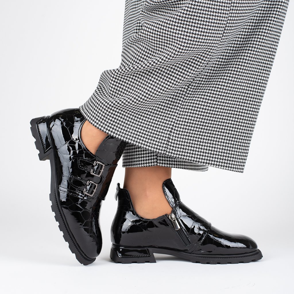 Dámské černé lakované mokasíny Letizia s přezkami a jemným reliéfem