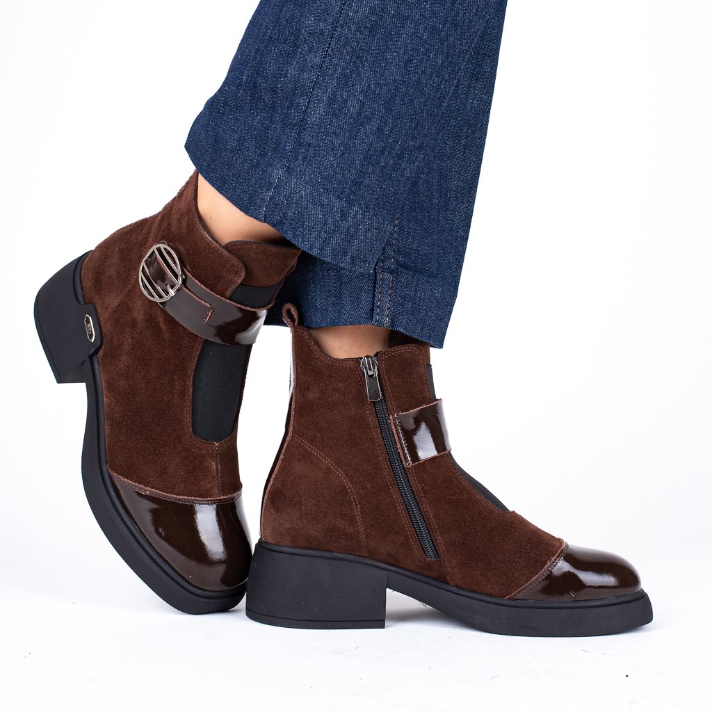 Dámské hnědé kotníkové boty Letizia z broušené a lakované kůže se sponou a vyšším podpatkem