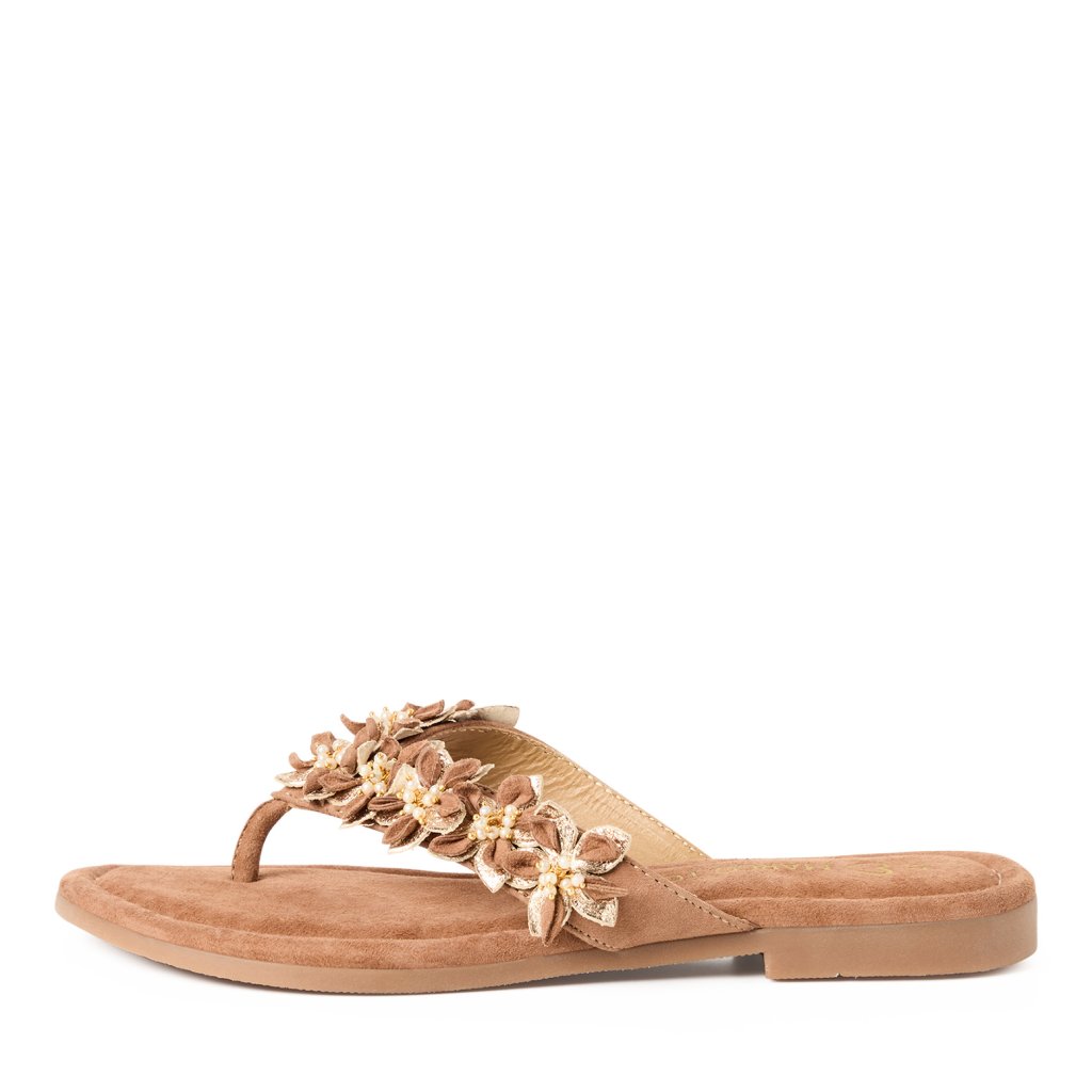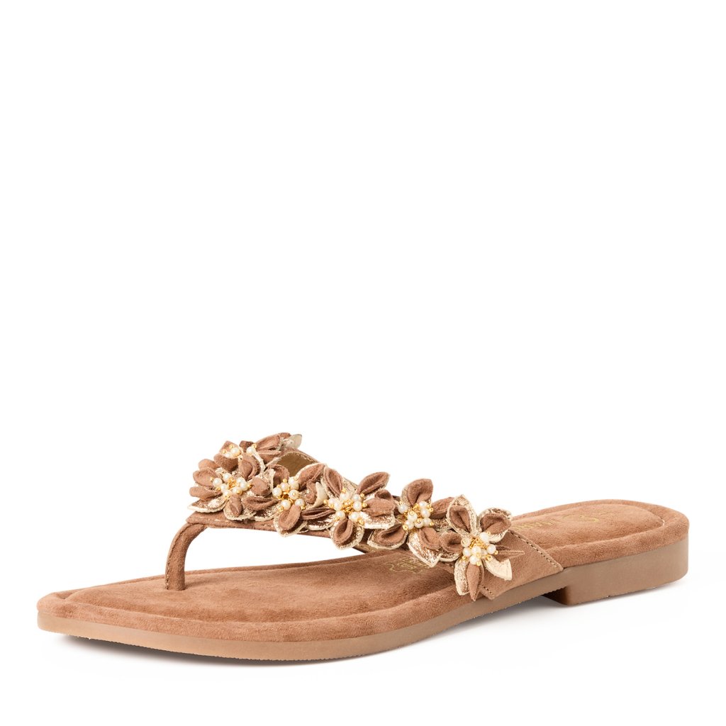 Horní pásek zdobí plastické květiny v přírodních tónech doplněné drobnými perličkami a zlatými detaily. Stylový detail, který funguje ve městě i na dovolené.