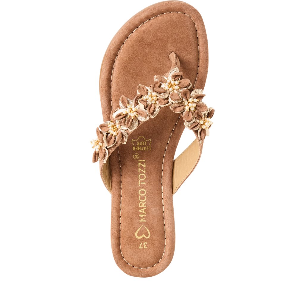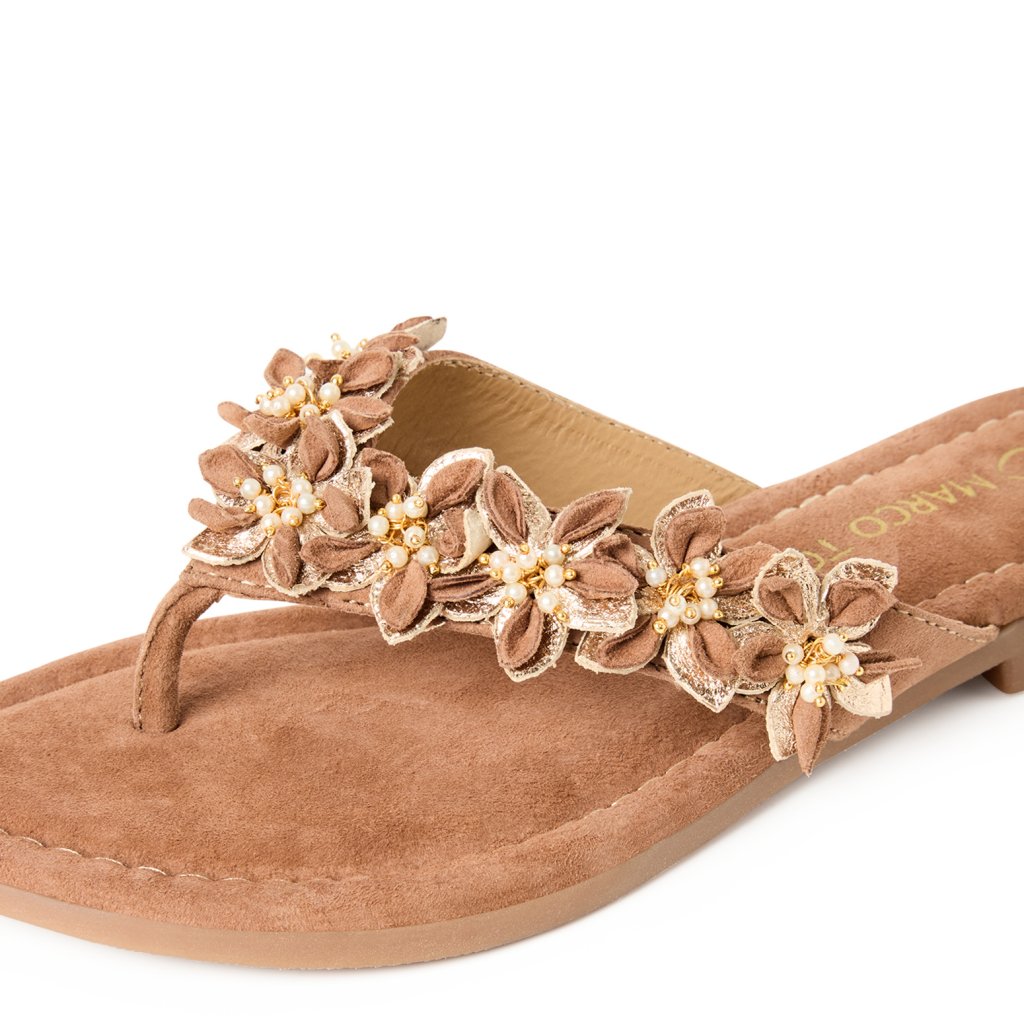 Dámské hnědé květinové nazouváky s perličkami Marco Tozzi