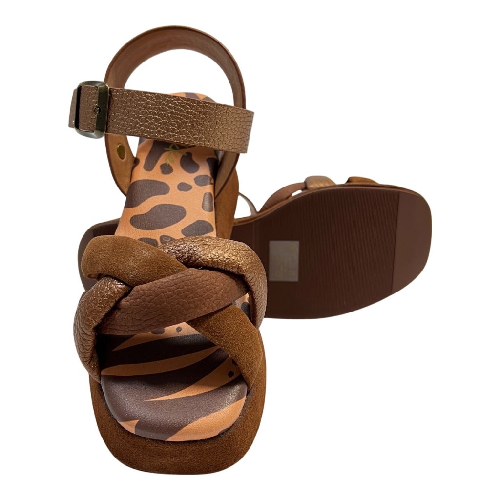 Stylově propletené pásky na nártu kombinují hladkou kůži a textilii, což vytváří zajímavou texturu bez zbytečné okázalosti. Zapínání kolem kotníku má pod přezkou nenápadnou gumičku, díky které se sandály lépe přizpůsobí noze a pohodlně sedí při chůzi.