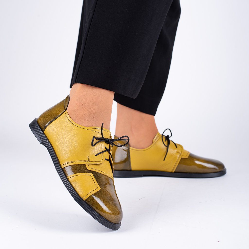 🍂 Tyhle šněrovací polobotky jsou jako stvořené pro milovnice originální elegance. Základ tvoří hořčicově žlutá kůže, která je jemně tónovaná tmavým efektem – připomíná list spadlý do ranní rosy, lesklý a proměnlivý jako samotný podzim.
