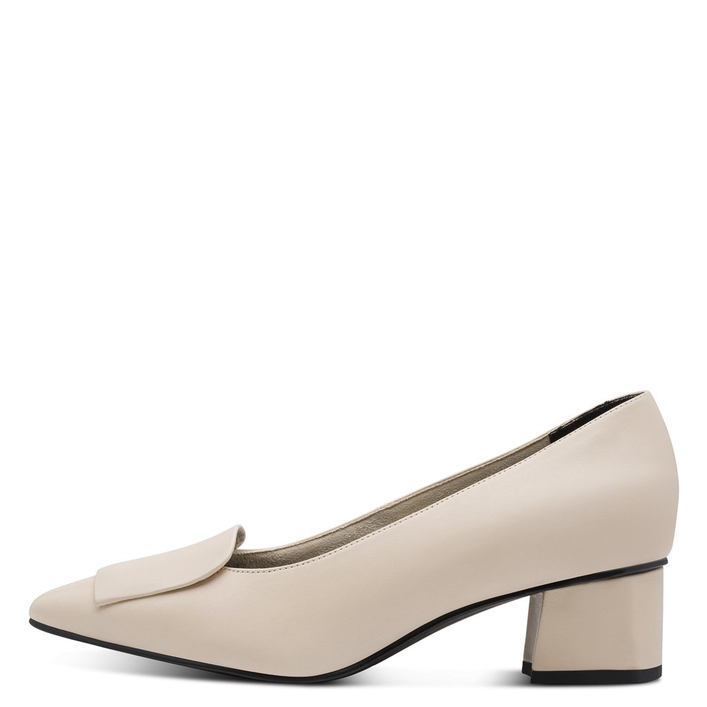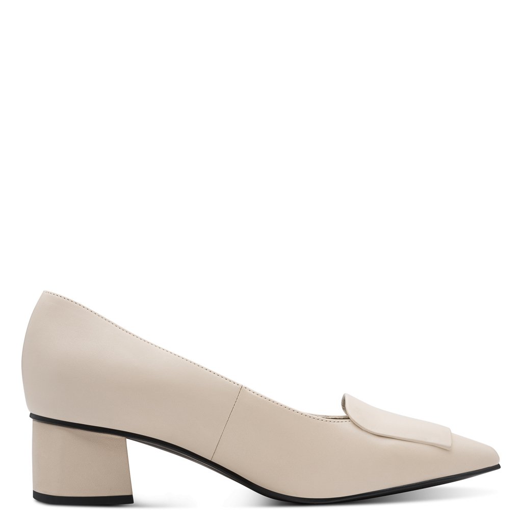 Krémové kožené lodičky Marco Tozzi s 4,5cm podpatkem a koženou stélkou. Elegantní, pohodlné a nadčasové – obujte je do práce i do města.
