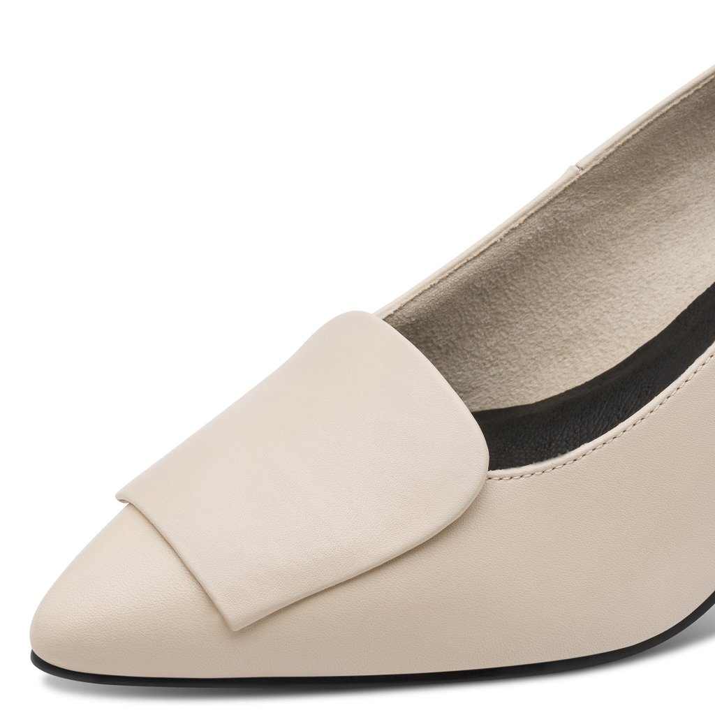 Dámské krémové kožené lodičky Marco Tozzi jsou přesně tím typem modelu, který využijete víc, než si myslíte. Čistá linie, jemný krémový odstín a decentní ozdoba na nártu vytváří nadčasový základ šatníku s jasným stylem. 🤍