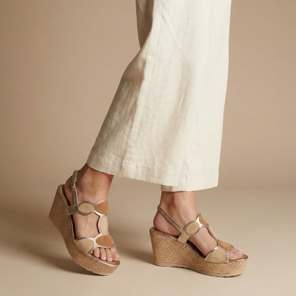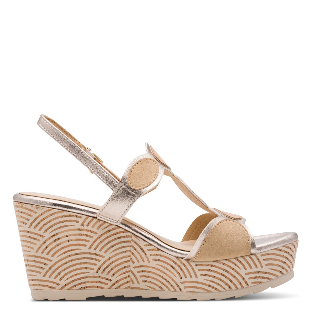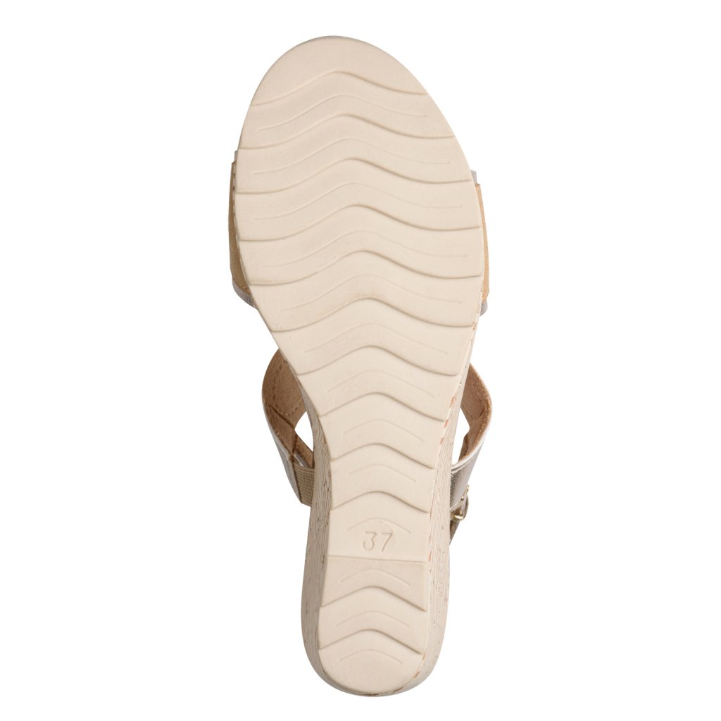 Dámské platinové sandály na klínku Marco Tozzi spojují eleganci, výšku a pohodlí v jednom letním modelu. Metalický platinový odstín působí slavnostně a je doplněn detaily v přírodních odstínech.