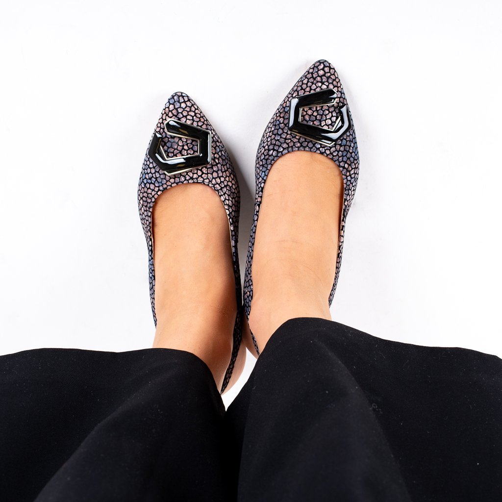 Model stojí na stabilním podpatku vysokém 7 cm, který je tvarovaný tak, aby dobře přenášel váhu a umožnil pohodlný pohyb i během delšího dne. V prstové části je ohebná špice, která se přirozeně přizpůsobí kroku a přispívá k celkovému komfortu. Uvnitř se nachází tvarovaná kožená stélka, která poskytuje oporu chodidlu a příjemný došlap.